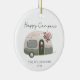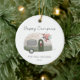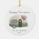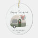 Camper Retro Green Christmas - ornament features an adorable retro camper, all decked out for the holidays with string lights, winter florals, berries and string lights. Happy Campers is in pretty, modern script typography and is personalized with your family name and year.
