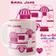 A cute vintage camper trailer with stripped awnings, hearts, and a bird cage in one of the windows. The background is a light pink chevron pattern. In mixed script fonts, is the simple rhyme: Roses are red, violets are blue, I will share my camper with you. The recipient's name is also on the mug above the camper. Between the adorable camper and the rhyme, there is a heart that serves as a template for initials. If you are looking for an unusual Valentine's gift for your sweetheart, this will make them smile every time they enjoy their coffee, tea, or hot chocolate.