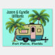 Campsite sign with little travel trailer and palm trees design. Include camper's names and hometown. Aqua blue background color with dark green, printed fonts. The same design and wording will be printed on both sides. On your RV adventures, let fellow campers know where you are from. This sign is 18 x 24 inches and comes with, or without, a stand.
