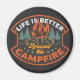 Retro badge style camping graphic features campfire with "Life Is Better Around the Campfire" text on dark aqua background