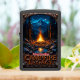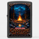 This captivating image showcases a custom, matte black rectangular case featuring a serene nocturnal graphic. The artwork depicts a glowing campfire set beside a tranquil stream, surrounded by scattered rocks and tall pine trees under a starry night sky. In the background, majestic snow-capped mountains rise dramatically. The entire picturesque scene is framed by a rustic, ornate wooden border with intricate, gothic-inspired scrollwork and accents. The name "Alexander" is displayed in bold red text above the fire. Below the scene, "CAMPFIRE LEGACY" is proudly presented in large, textured brown lettering. This evocative depiction makes for a charming and artistic collectible item, capturing the spirit of wilderness adventures.