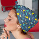 Be ready for your next adventure with this bandana featuring an outdoorsy themed print. Illustrations of hiking boots, fanny packs, binoculars, enamel mugs, butterflies and flowers in shades of yellow, blue and teal are set against a navy blue background.