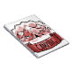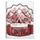 Tent, trees and "Camping" ribbon. Hand drawn badge with red watercolor tint