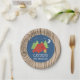 Camping birthday party plates with tent, trees and wood background.