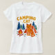Friendly orange cat at the campfire, surrounded by fir and tent sky. Lively colors, playful cartoon style - ideal for outdoor fans, children's clothing and cozy leisure looks.