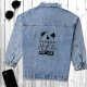 Rock this sassy denim jacket for hiking or any camping getaway. Features a silhouette image of a primitive tent camp site and and the slogan "Camping Hair, Don't Care", all printed in crisp black.