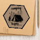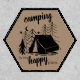 Camping and adventure themed patch lettered with "camping is my happy place". The design has a light brown background, which is editable, and a sketched illustration of a tent in the woods at night. Perfect for campers, the adventurous and outdoor lovers.