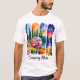 This white t-shirt showcases four vertical, watercolor-style stripes representing camping scenes. From left to right: a tent in a forest, a vintage red and white camper van by a lake, a forest with a campfire and chairs, and a lakeside view under a vibrant starry night sky. The text "Camping Mode" is below in a cursive font.