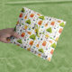 Camping outdoor gear pattern includes tent, shovel, campfire, guitar, a mug, and backpack on white background. It is ideal for decoupaging craft supplies and gift wrapping.