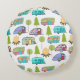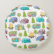 Decorate your home or camper with these fun round throw pillows featuring a campground design pattern of campers, campfires, and trees.