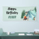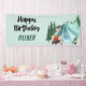 Camping themed welcome banner - perfect for one happy camper, sleepovers, backyard bbq, picnic or outdoor birthday party. This green and blue watercolor design has mountain and forest scenery with tent, campfire and smores. The title reads "Happy Birthday" and you can personalize with your name.