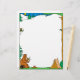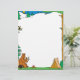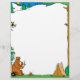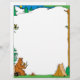 This vacation letterhead features a camping scene with a tent and a big bear sitting on a log while sipping a drink and roasting marshmallows on a campfire.