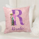 Purple shimmer capital letter R with fancy pink winged fairy costumed actor vintage photo cutout and customizable purple text can be used to add a name or message. (Or completely remove to leave design as an illustrated letter/monogram.) A throw pillow with a charming compilation for those that love campy altered art on a distressed pink background