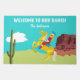 Welcome guests to your ranch, barn or home in style with this personalized doormat. It features a campy, retro style illustration of a cowgirl on a horse in a western landscape and your own welcome message and name in white lettering against the bright blue sky.