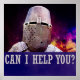 Closeup view of a helmet and an plate armor of a medieval knight against the colorful background which imitates the outer space or a battlefield to your liking. Text - Can I help you - added