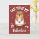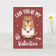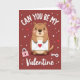 This Valentine's Day card shows a cute, chubby light-brown cartoon critter that looks a bit like a friendly groundhog. It has big wide eyes, pink cheeks, and a tiny pink tongue peeking out, giving it a sweet, hopeful expression. The character holds a white envelope in the center, sealed with a bright red heart ❤️. The background is a deep reddish-brown, sprinkled with small white hearts, a few red hearts, and tiny white dots like confetti. At the top, the words “CAN YOU BE MY” appear in white block letters, and “Valentine” sits below in white script lettering. Near the bottom, there’s a soft pink padlock with a silver shackle on the left and a simple white key on the right, hinting at opening someone’s heart 💌🍫. Hope this helps you share kind, caring Valentine’s Day feelings with someone special.
