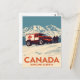 Send a rugged and adventurous piece of Canadian travel art with this postcard! Inspired by classic mid-century travel posters, this illustration captures the spirit of off-road exploration in Alberta, Canada. The design features a bold, red and white all-terrain vehicle adorned with the iconic Canadian maple leaf, set against a dramatic backdrop of snow-capped mountains. Two explorers are visible, taking in the vast, winter landscape.