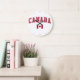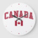 This item has CANADA in a collegiate style in an arc over the Canadian flag. The design uses the Canadian colors of red and white. The Canadian flag has two vertical red bars with a white square between them and a red Canadian maple leaf in the center.