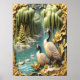 Two majestic Canada geese stand prominently on a serene riverbank, surrounded by a tranquil procession of lush, weeping willow trees that drape elegantly over the peaceful waters where ducklings gently paddle. Golden flowers bloom on ornate frames, adding a touch of whimsy to the twilight scene.