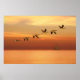 Six Canada Geese are seen flying in formation against a sunset sky. They are flying over the water and the darken outline of a sailboat is seen on the horizon.