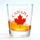 Red and white Canada shot glass with Canadian flag and maple leaf. Customizable text. Great gift for Canadians.