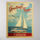 This Greetings From Canada vintage travel nautical design features a boat sailing on the water with seagulls and a blue sky filled with gorgeous puffy white clouds.