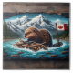 A beaver constructs a lodge in a river, surrounded by majestic mountains and a Canadian flag in the background under a bright, clear sky.