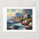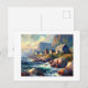 Coastal homes rest on a rocky shoreline with waves crashing against the rocks. The scene is set against a backdrop of dramatic cliffs and a vibrant sky.