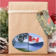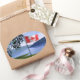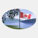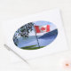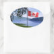 Stickers with my artwork of a Canadian flag overlooking a lake, green hills and a maple tree.