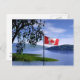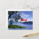 Postcard with my artwork of the Canadian flag and a scenic view of water and hills.