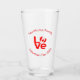 Fun drinking or beer glass for Valentine's Day featuring a heart shaped flag of Canada. It is used to create the O in the word LOVE. The other letters are red. Above, in red letters, are the words YOUR NAME FAMILY. Change that to any text you like. Below are the words VALENTINE'S DAY 20??. Change the year. Or, change the text to whatever you wish. Great gift for the "him" in your life, too. Fun way for Canadians to celebrate their love of their heritage with a housewarming gift.