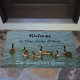 Canadian Geese, a gander, a goose and their goslings, on lake water with your personalized greeting, Lake, lakefront cabin or lake house name and your Family Name all customizable on this photographic Welcome doormat. Canadian Geese mate for life and in this photography the two larger parents are seen with their young brood of smaller goslings. The distinctive colouring of the Canadian Geese with their black head and neck, white cheeks, white under its chin, brown body, white bottom and black tail is on display against the blues and green of the lake's water in this beautiful wildlife family portrait. This is original bird photography of Lake Norman in North Carolina, USA by JLW_PHOTOGRAPHY.