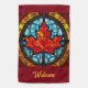Stylish garden flag features an AI generated stained glass with Canada's iconic red maple leaf in center. Customize your own "welcome" greeting or leave as-is