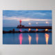 The lights of the Canal Park breakwater reflect on Lake Superior at dawn.
