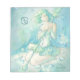 A watercolor with ink pen, and the symbols of Cancer the Crab: the ocean tide, seafoam, A girl clad in protective, ornate armour with soft, ruffled skits and garments beneath, the colors of the ocean. In her hand she holds an ornate staff textured like seafoam, with a top shaped like a crab's claw. Waterdroplets swirl around. A watery painting with aqua, teal, blue-green, subtle warm sand, and soft hints of grey and greyish blue.