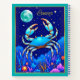 Journal in an illustration of the Cancer zodiac sign featuring a large, blue crab with orange accents set against a starry night sky. A glowing full moon hovers above, while colorful, dreamlike sea flora fills the foreground.