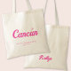 Get the party started with this Cancún bachelorette party retro pink personalized tote bag. This trendy design features your Bachelorette city in a stylish retro font, with plenty of room for customization with the bride's name and the date. Perfect add some fun and flair to your event.