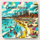 Pop art comic book style art scene of a beach with a vintage vibes. AI Art depicts people having fun on the beach shoreline with hotels and and apartments buildings in the background, pretty palm trees, colorful umbrellas and a gorgeous blue cloudy sky in Cancun, Mexico.