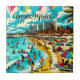 Pop art comic book style art scene of a beach with a vintage vibes. AI Art depicts people having fun on the beach shoreline with hotels and and apartments buildings in the background, pretty palm trees, colorful umbrellas and a gorgeous blue cloudy sky in Cancun, Mexico.