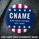 Badge pinback button with your candidate name and custom text/slogan/tag line. White text and stars on a blue background with red and white striped borders.