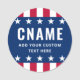 Badge magnetic or pinback button with your candidate name and custom text/slogan/tag line. White text and stars on a blue background with red and white striped borders.