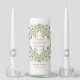 This candle unity set is shown with an olive green filigree shaped into an oval with the phrase inside of "One Love For All Time And Eternity". Sample text shown in colors of gold-tone. Add personalized monogram on each taper inside the oval shaped filigree. White candle. Customize this item and change the sample names, colors to yours.