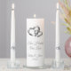 This candle unity set is shown with a wedding two hearts design with hearts in a silver tone with crystals and grey text.