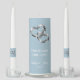 This candle unity set is shown with a wedding two hearts design with hearts in a silver tone with crystals and white text on a dusty blue background color.