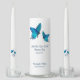 This candle unity set is shown with a wedding two hearts design with blue butterflies. Text reads " And The Two Shall Become One" "Ephesians 5:31". Personalized monogram on each taper.