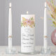 This wedding unity candle set is shown with a pink lily image with two hearts. Text reads " Two Hearts Become One". Personalized monogram on each taper with pink lily. Personalized names and wedding date on front of middle candle.
