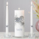 This candle unity set is shown with a wedding two hearts linked design with hearts in a gray-silver color with flowers on each heart. Navy Blue script-text. Text reads " And the Two shall become One" with "Ephesians 5:31" in very fine text beneath the quote, inside the largest heart. Personalized monogram on each taper inside the single heart.