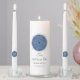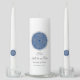 This candle unity set is shown with the phrase of "Two shall be One". One filigree circle in silver-tone overlaid upon blue on the front of this candle. Sample text shown in colors of silver-tone. Personalized monogram on each taper. White candle. Customize this item and change the sample names, colors to yours.