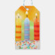 A tag with a birthday cake with three candles, the background is orange and green, the cake is white with colorful sprinkles, the candles are yellow with orange stripes, blue with purple stripes, and orange with red stripes.