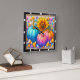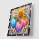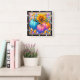 This square wall clock features a vibrant yellow sunflower surrounded by three colorful pumpkins in shades of blue, pink, and orange, all adorned with whimsical polka dots. Scattered candy corn and sweet pills fill the background, creating a playful and fantastical autumn harvest scene, perfect for a cheerful seasonal display.